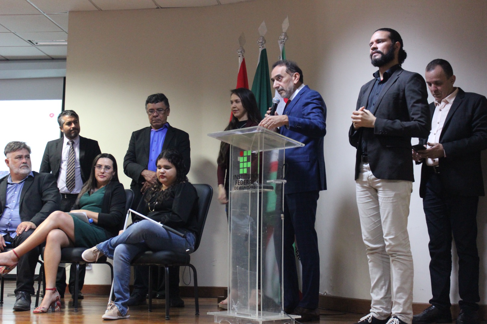 Reitor Carlos Guedes convida Jousiclécia Almeida, estudante com deficiência visual do Ifal Arapiraca, para dar seu depoimento no encerramento da posse