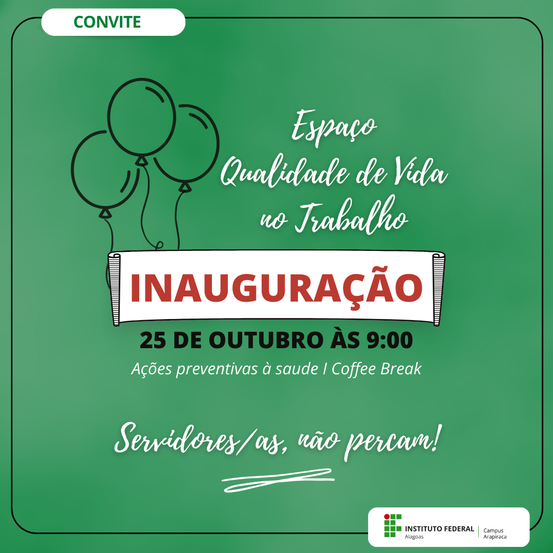 O lançamento seguinte é o do Espaço QVT, que ocorrerá no dia 25 de outubro, às 9h. O local está situado atrás da cantina (antiga sala de almoxarifado) e servirá como ambiente de descanso e alimentação para servidores/as e terceirizados/as. A programação da inauguração prevê ações preventivas à saúde dos/as trabalhadores/as do campus e coffee break comemorativo. Confira o convite!
