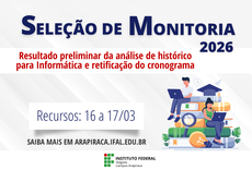 O Instituto Federal de Alagoas - Ifal Campus Arapiraca torna público, nesta sexta-feira (13), o resultado preliminar da análise de histórico escolar referente à seleção de monitoria para disciplinas do curso técnico de Informática da unidade de ensino.
