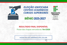 A Comissão Eleitoral torna público, nesta quinta-feira (18), o resultado final do processo eleitoral para escolha das novas diretorias dos Centros Acadêmicos (CAs) dos cursos superiores do Ifal Arapiraca, no biênio 2025–2027.