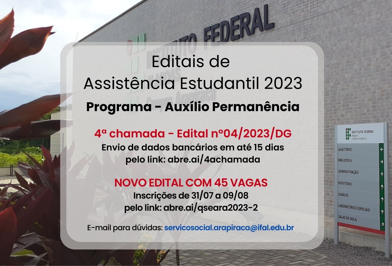 Ifal Arapiraca faz 4ª chamada do Auxílio Permanência e divulga edital com novas vagas da Assistência Estudantil