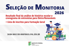 Foi publicado, na aba de Editais do site do Instituto Federal de Alagoas - Ifal Campus Arapiraca, a lista de inscrições homologadas no Edital 06/2026, de seleção de monitoria para disciplinas da Formação Geral.