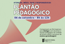 No dia 6 de setembro, de 8h às 12h, irá ocorrer o Plantão Pedagógico, evento onde docentes, equipe pedagógica e demais membros envolvidos no ensino no campus recebem pais, mães e responsáveis por alunos/as para dialogar sobre os estudos e as vivências do corpo discente.