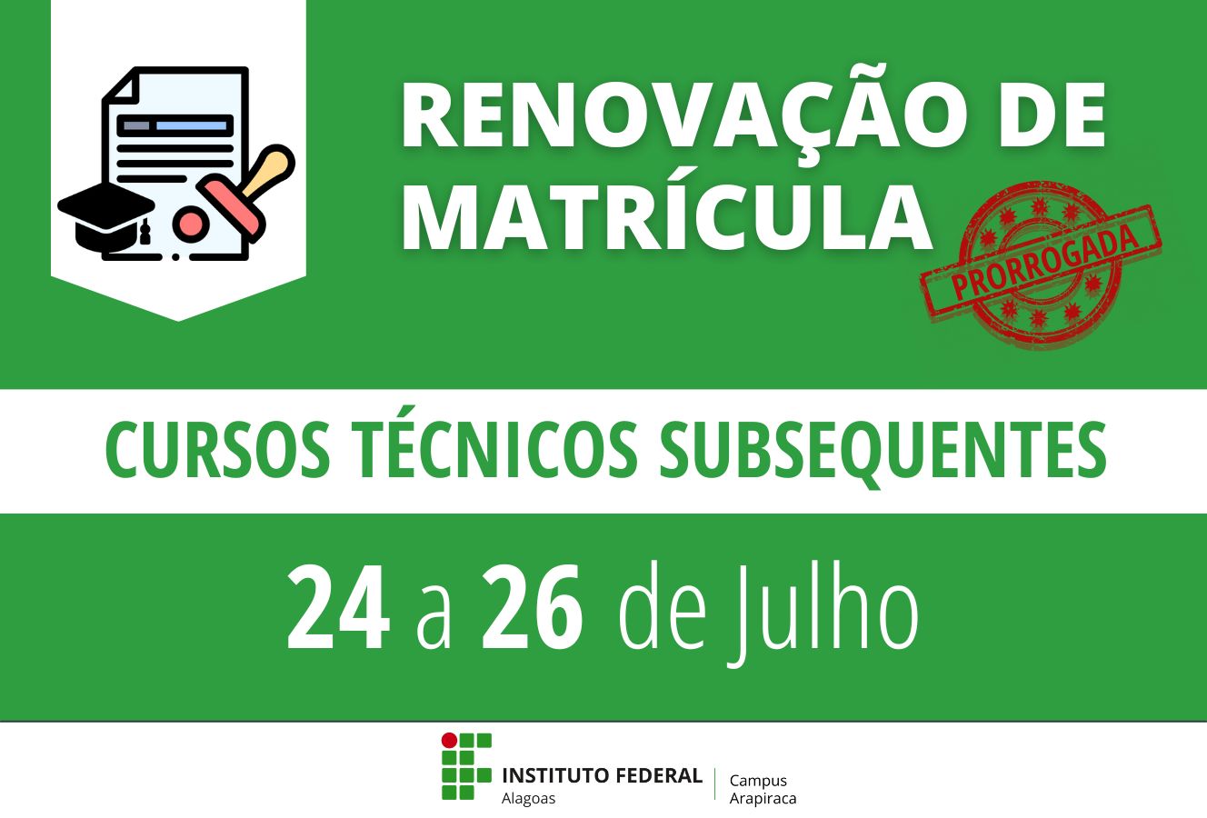 Prazo para renovação de matrícula de cursos subsequentes encerra em 26/07