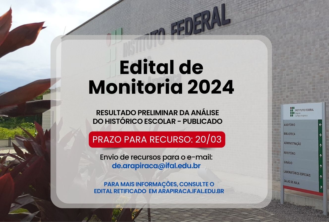 Resultado preliminar da fase 1 e edital retificado da seleção de monitoria são publicados; prazo para recurso encerra hoje (20)