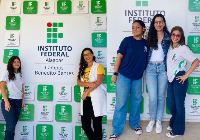 Professora Jordana Rangely com as alunas Gabrielle Sophie Tenório Lins, Caroline Otte Pedrosa, do segundo ano, e Ellis Regina Santos Tavares, do terceiro ano.