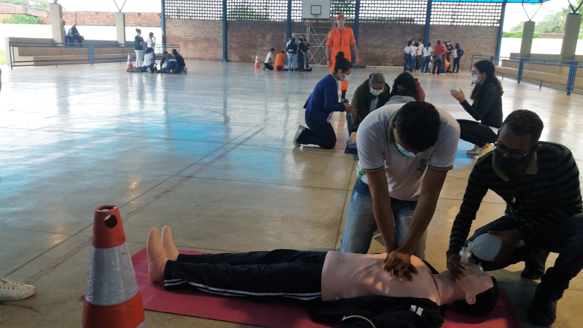 Alunos e alunas do curso técnico subsequente em Enfermagem durante treinamento do Corpo de Bombeiros