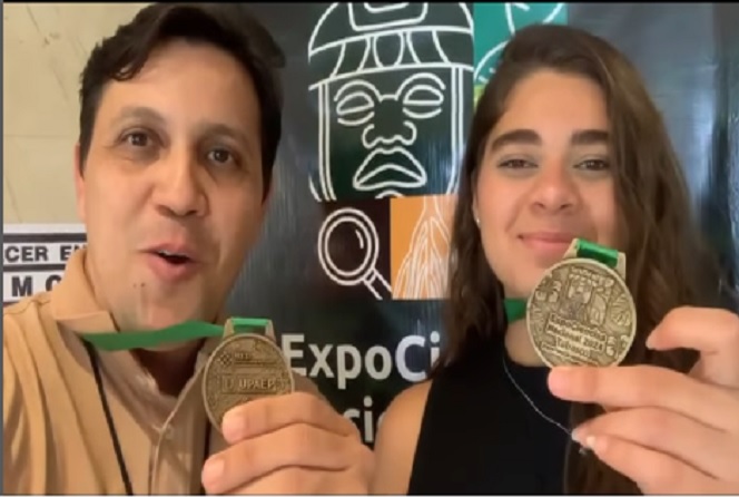 Professor Diego da Guia e a aluna Mariana Madeiro mostram medalhas de menção honrosa obtidas durante o evento científico
