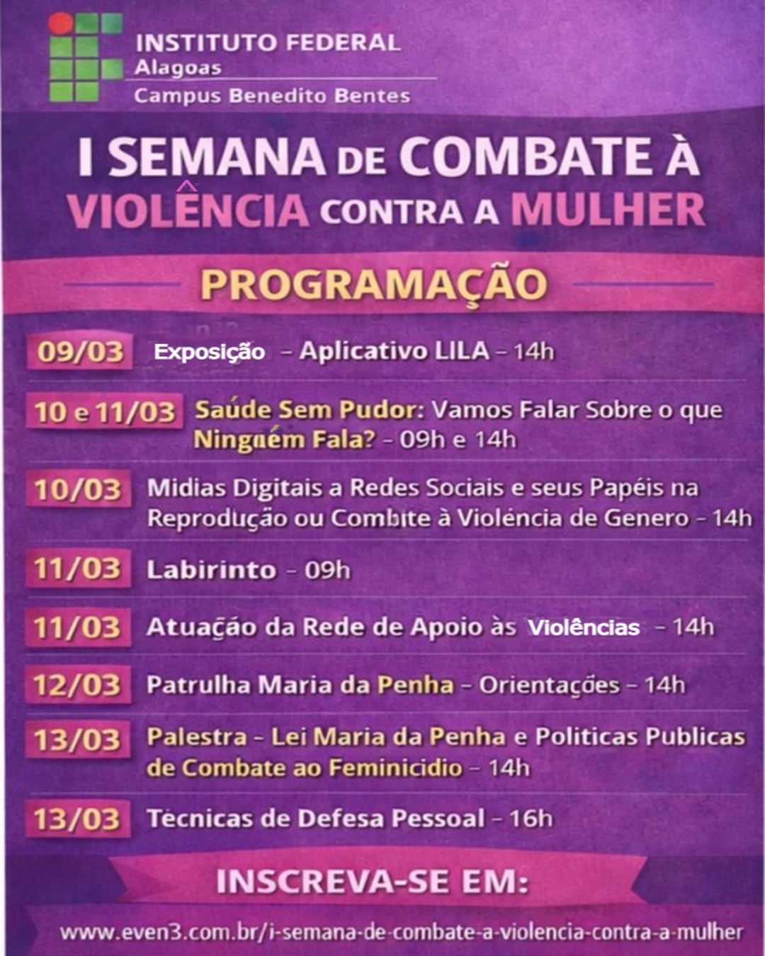 Ifal Benedito Bentes promove de 9 a 13/3 a 1ª Semana de Combate à Violência contra a Mulher