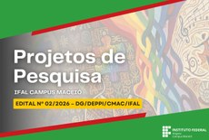 As inscrições para a submissão de projetos de pesquisa voltados a ações afirmativas para o Ifal Maceió, permanecem abertas até o dia 27 de abril de 2026. A iniciativa é regida pelo Edital número 02/2026 da Direção Geral e da Diretoria de Extensão, Pesquisa, Pós-Graduação e Inovação do campus.
