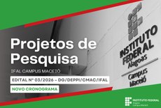 As inscrições referentes ao edital nº 03/2026 – DG/DEPPI/CMAC/IFAL, que prevê a submissão de projetos de pesquisa aplicada voltados à melhoria da infraestrutura, eficiência no uso de água e energia e desenvolvimento de soluções para a gestão interna do Campus Maceió, seguem abertas até 04 de maio de 2026. O edital foi republicado com adiamento do prazo de inscrições e retificação do cronograma oficial publicada em 27 de abril.