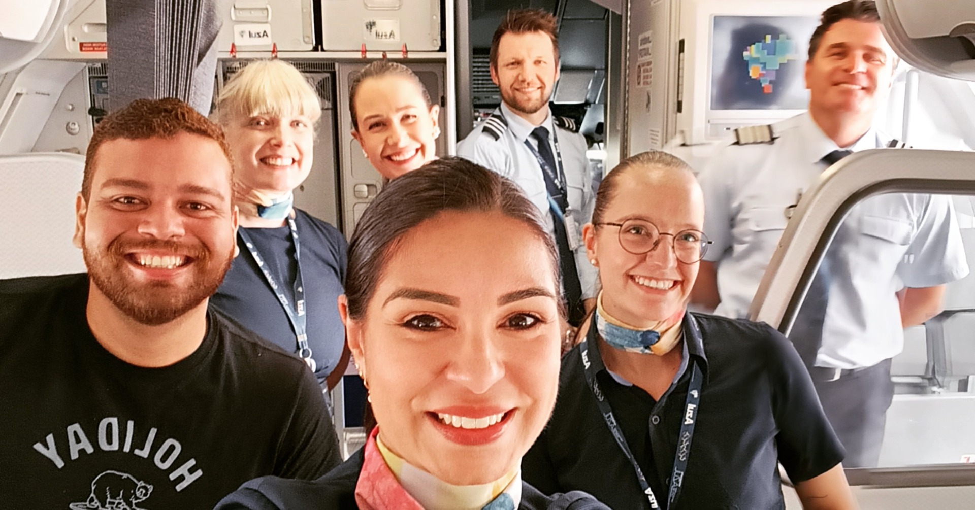 A primeira viagem internacional de Levy foi também seu primeiro vôo. Na foto, tripulação do vôo com destino a Belém, primeira conexão da viagem.