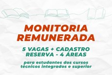 Estão sendo ofertadas cinco vagas, com bolsa no valor de R$ 400 reais, para os componentes curriculares Matemática e Física - para todos os cursos técnicos integrados, nos três turnos; Língua Portuguesa - para estudantes do curso superior de Licenciatura em Letras - Português; e Laboratório de Meio Ambiente - para estudantes do 3° ano do curso técnico integrado em Meio Ambiente.