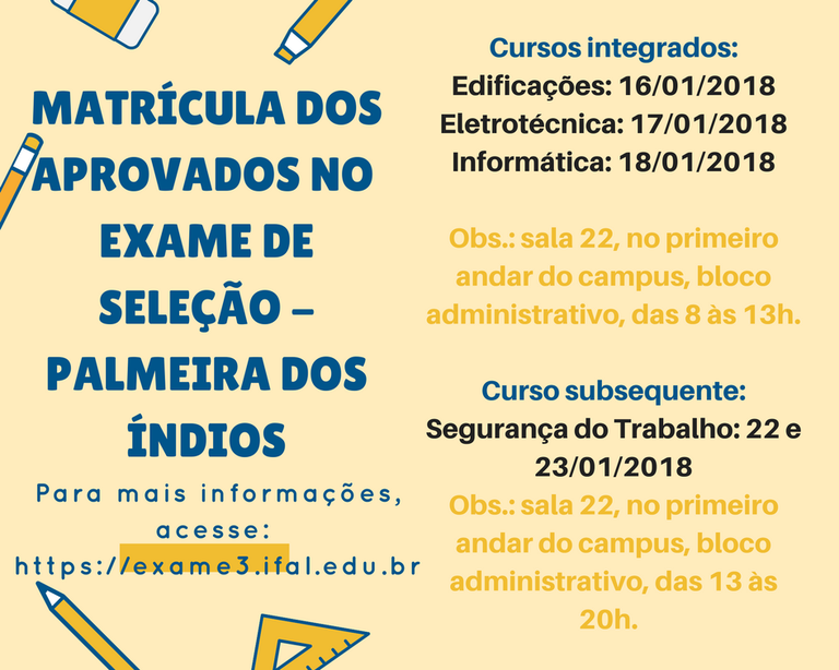 Confira o calendário de matrícula para os aprovados no Exame de Seleção do Ifal em Palmeira