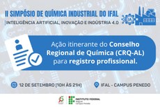 Na sexta-feira, 12, o Instituto Federal de Alagoas – Campus Penedo receberá o Conselho Regional de Química da 17ª Região (CRQ-AL) como parte das atividades do 2º Simpósio de Química Industrial, que será realizado a partir desta quarta-feira, 10. Em mais uma ação itinerante, a equipe estará disponível das 10h às 21h para atender técnicos e demais profissionais que desejam efetivar seu registro junto ao órgão e obter a carteira profissional.