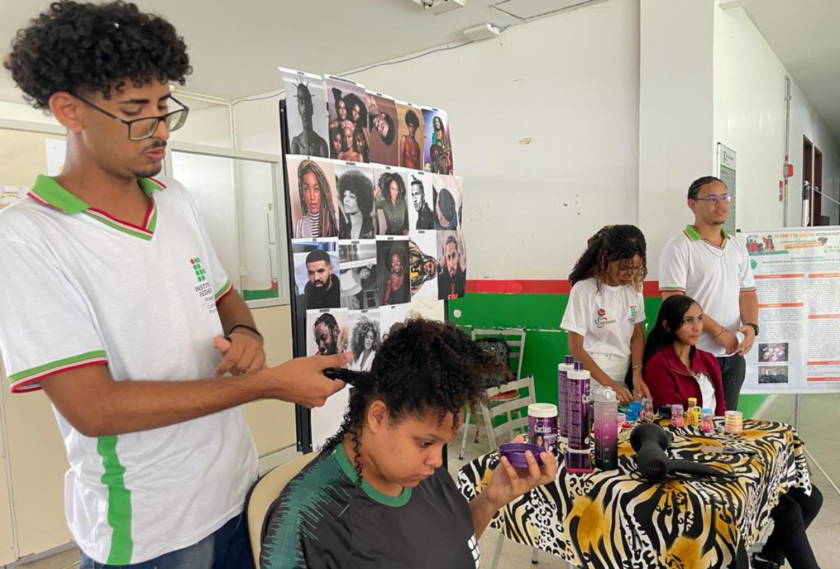 Oficina de finalização de cabelos com estudantes do projeto de pesquisa Encrespando as Ideias.