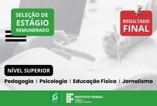 A seleção de estágio envolveu a oferta de quatro vagas para as áreas de Pedagogia, Psicologia, Educação Física e Jornalismo. A atividade terá vigência de seis meses e será remunerada com bolsa mensal no valor de R$ 787,98, para os estagiários que cumprirem a carga horária de 20h por semana, e de R$ 1.125,69 para 30h semanais. Além da bolsa, será concedido auxílio-transporte no valor de R$ 10,00 por dia de trabalho presencial.
