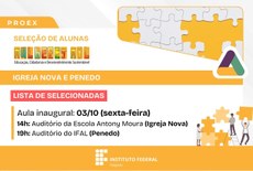 O Instituto Federal de Alagoas (Ifal) divulga as listas de selecionadas para os cursos do Programa Mulheres Mil nas cidades de IGREJA NOVA (Cuidadora de Idosos) e PENEDO (Operadora de Supermercado). Como as vagas são limitadas, apenas as 35 primeiras de cada lista estão convocadas para a aula inaugural que ocorrerá no dia 3 de outubro, às 14h, no auditório da Escola Antony Moura, em Igreja Nova, e às 19h, no auditório do Ifal Penedo.