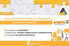 Estão abertas as inscrições para seleção de estudantes monitores e de profissionais que atuem como apoio pedagógico do Programa Partiu IF nos campi do Instituto Federal de Alagoas (Ifal). Conforme os editais publicados pela Pró-reitoria de Extensão (Proex), o prazo para se inscrever de forma on-line vai até o dia 24 de fevereiro.