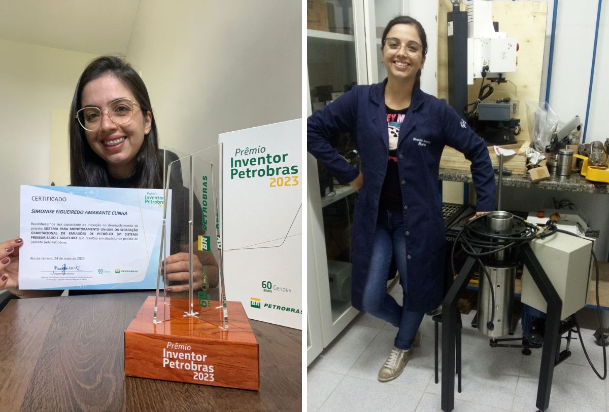 Docente premiada e, à direita, no laboratório com parte do equipamento desenvolvido