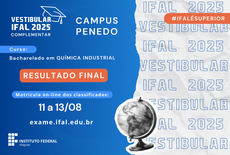 O Instituto Federal de Alagoas (Ifal) divulgou, nesta quinta-feira, 7, o resultado final do Vestibular Complementar 2025 para ingresso no curso superior em Química Industrial do Campus Penedo. Os arquivos publicados no site exame.ifal.edu.br incluem a relação dos candidatos CLASSIFICADOS dentro do número de vagas ofertadas, a lista de SUPLENTES e o EDITAL DE MATRÍCULA.