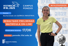 O Instituto Federal de Alagoas – Campus Penedo torna público o RESULTADO PRELIMINAR da matrícula on-line no curso superior em Química Industrial, após análise da documentação enviada pelos convocados do Vestibular 2025. Os candidatos na situação de indeferidos têm até esta terça-feira, 17, para entrar com recurso on-line e enviar a documentação pendente.