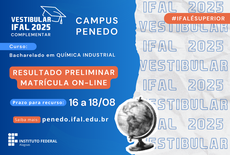 O Instituto Federal de Alagoas – Campus Penedo torna público o RESULTADO PRELIMINAR da matrícula on-line no curso superior em Química Industrial, após análise da documentação enviada pelos classificados no Vestibular Complementar 2025. Conforme o cronograma do edital de convocação, o prazo para recurso on-line vai de 16 a 18 de agosto.
