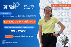 O Instituto Federal de Alagoas (Ifal) publicou edital de matrícula convocando os aprovados no Vestibular 2025 para ingresso no curso superior em Química Industrial, ofertado no Campus Penedo. O edital completo deve ser conferido no site exame.ifal.edu.br, onde também se encontra publicada a lista final dos candidatos classificados após o procedimento de heteroidentificação.