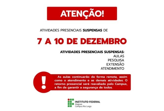 Campus Rio Largo suspende atividades presenciais entre 7 e 10 de dezembro