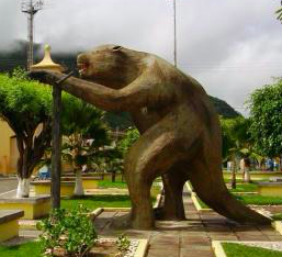 Em praça da cidade, reina uma réplica de animal pré-histórico.