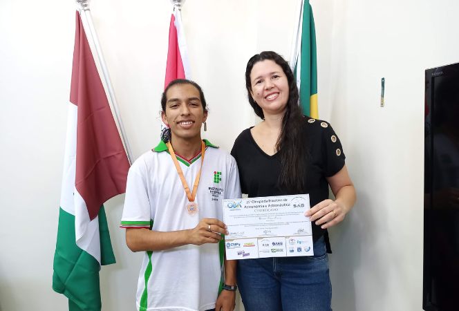 Professora Norma Amorim, coordenadora da OBA no Campus, entrega certificado e medalha de bronze ao aluno Murilo Pedro Pereira