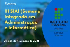 O Instituto Federal de Alagoas (Ifal), Campus Viçosa, realizará entre os dias 24 e 28 de novembro de 2025 a III Semana Integrada em Administração e Informática (SIAI), um dos eventos acadêmicos mais aguardados pela comunidade estudantil. A programação propõe uma imersão completa nos temas que movimentam o universo da gestão, da tecnologia, da inovação e das práticas profissionais que moldam o futuro dessas áreas.