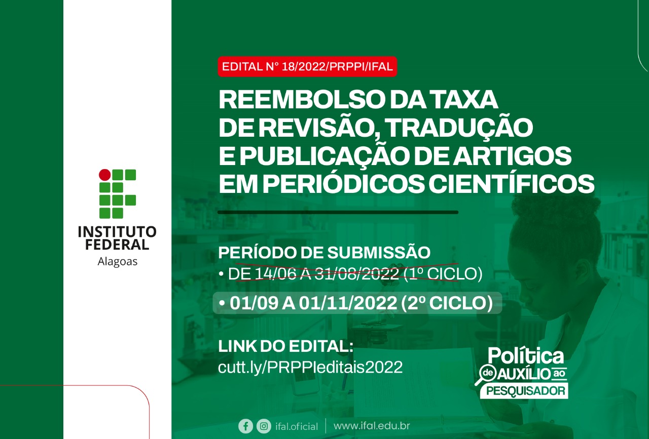Aberto 2º ciclo do edital nº 18/2022 - PRPPI/IFAL de Apoio à Publicação Científica