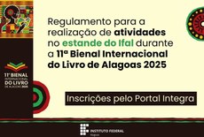A Pró-Reitoria de Pesquisa, Pós-Graduação e Inovação (PRPPI) reforça o convite aos servidores do Instituto Federal de Alagoas (Ifal) interessados em propor atividades para o estande institucional na 11ª Bienal do Livro de Alagoas. A chamada tem o objetivo de organizar uma programação com atividades de natureza acadêmica, científica e artística para o público da Bienal.