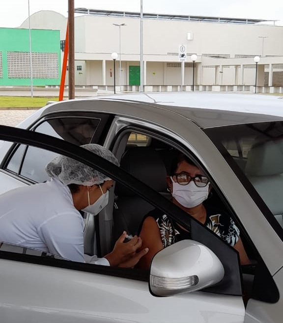 Primeira idosa a ser vacina do drive-thru do Campus São Miguel