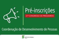 A Coordenação de Desenvolvimento de Pessoas (CDP) informa a abertura de pré-inscrições para o 21º Congresso Brasileiro de Pregoeiros e Agentes de Contratação, que será realizado de 23 a 26 de março de 2026, em Foz do Iguaçu, voltado para servidores que atuam como pregoeiros e equipes de Apoio, presidentes e membros de Comissões de Licitação, como também ordenadores de despesa e fiscais e gestores de contratos. Saiba mais, clicando aqui.