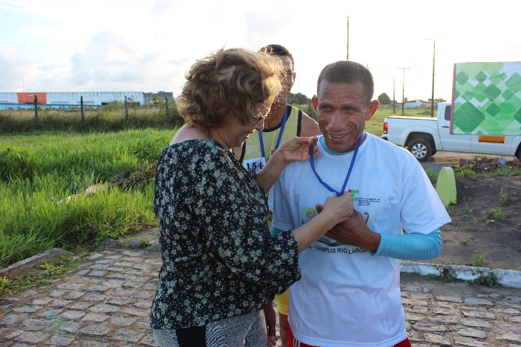 Prefeita de Rio Largo, Eliza Alves, entrega a medalha ao 2º lugar na corrida, José Leite da Silva