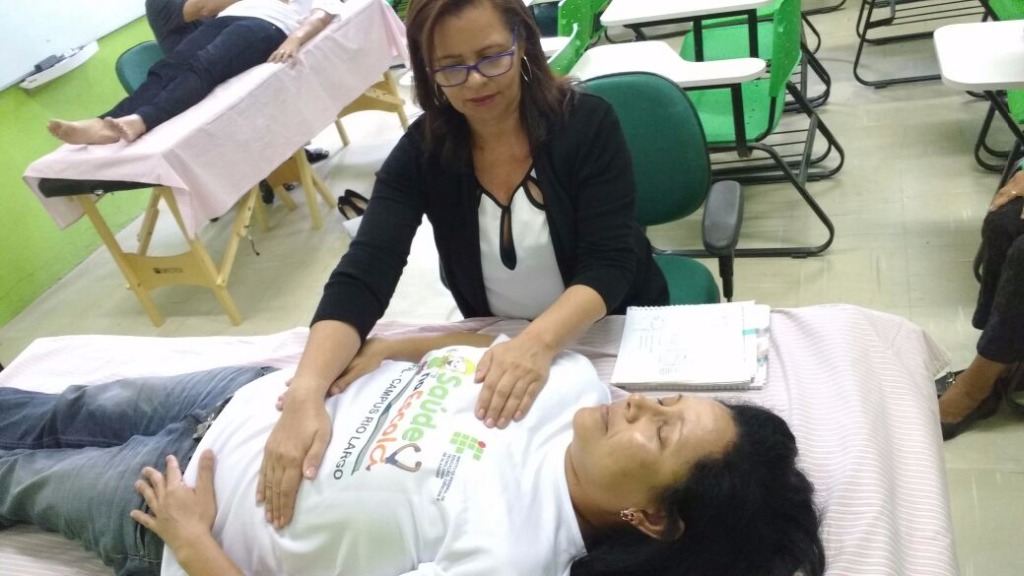 Silvana Machado aplica a terapia Jin Shin Jyutsu em uma das participantes do Saúde na escola