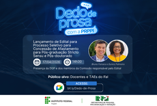 A Pró-reitora de Pesquisa, Pós-graduação e Inovação realiza na próxima sexta-feira (17), a partir das 14h30, mais uma edição do Dedo de Prosa. Desta vez, o atual coordenador de Qualificação Acadêmica, e a pró-reitora Eunice Palmeira, irão fazer orientações aos servidores interessados em submeterem inscrição no processo seletivo para concessão de afastamento para pós-graduação, cujo edital deverá ser lançado no mesmo dia.