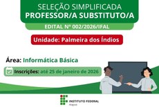 O Instituto Federal de Alagoas (Ifal) abriu Processo Seletivo Simplificado (PSS) para a contratação de professor substituto na área de Informática Básica no Campus Palmeira dos Índios, no Agreste alagoano. A seleção é regida pelo Edital nº 002/2026 e prevê uma vaga para contratação imediata, com jornada de 40 horas semanais, além de cadastro de reserva. As inscrições são gratuitas e devem ser realizadas exclusivamente on-line, no período de 10 de janeiro até as 23h59 do dia 25 de janeiro de 2026, por meio do site oficial de concursos do Ifal.