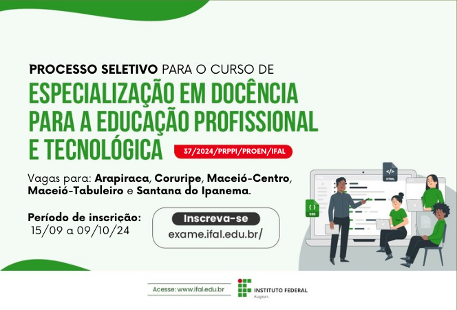 Ifal oferta 200 vagas na especialização em Docência na Educação Profissional e Tecnológica