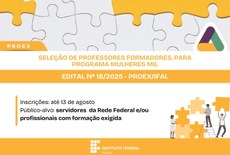 A Pró-Reitoria de Extensão (Proex), do Instituto Federal de Alagoas (Ifal), prorrogou as inscrições para o edital nº 18/2025, para a Seleção de Professores Formadores, visando atender ao Programa Mulheres Mil. São 76 oportunidades para atuação em cursos ofertados nos municípios de Arapiraca, Murici, Santana do Ipanema e São Miguel dos Campos.