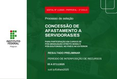 A Pró-reitoria de Pesquisa e Pós-graduação e Inovação (PRPPI) divulgou nesta terça-feira (4) o resultado preliminar do Edital nº 11/2025-PRPPI/IFAL, referente ao Primeiro Ciclo do processo seletivo para concessão de afastamento a servidoras/es para cursos de pós-graduação stricto sensu e de pós-doutorado no País e no exterior. Confira aqui!
