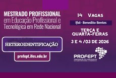Os candidatos que se autodeclararam negros (pretos ou pardos) no Exame de Seleção para ingresso de estudantes do Mestrado Profissional em Educação Profissional e Tecnológica do Ifal, Campus Benedito Bentes são convocadas/os para realização do procedimento de Heteroidentificação e Validação Étnico-racial e que tenham se inscrito nas demandas para candidatas/os negras/os, indígenas e quilombolas. Esses devem encaminhar até esta quarta-feira (4/3), o envio dos seguintes arquivos: